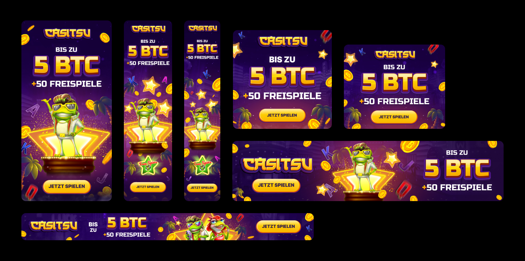 A banner pack was created for the Casitsu brand, inspired by the popular slot Elvis Frog in Vegas, tailored to the target geo. The pack includes 18 banner sizes, fully optimized for various platforms and devices. Localization for multiple languages was implemented to effectively reach an international audience. The design emphasizes bonuses and features a clear call to action to engage users.