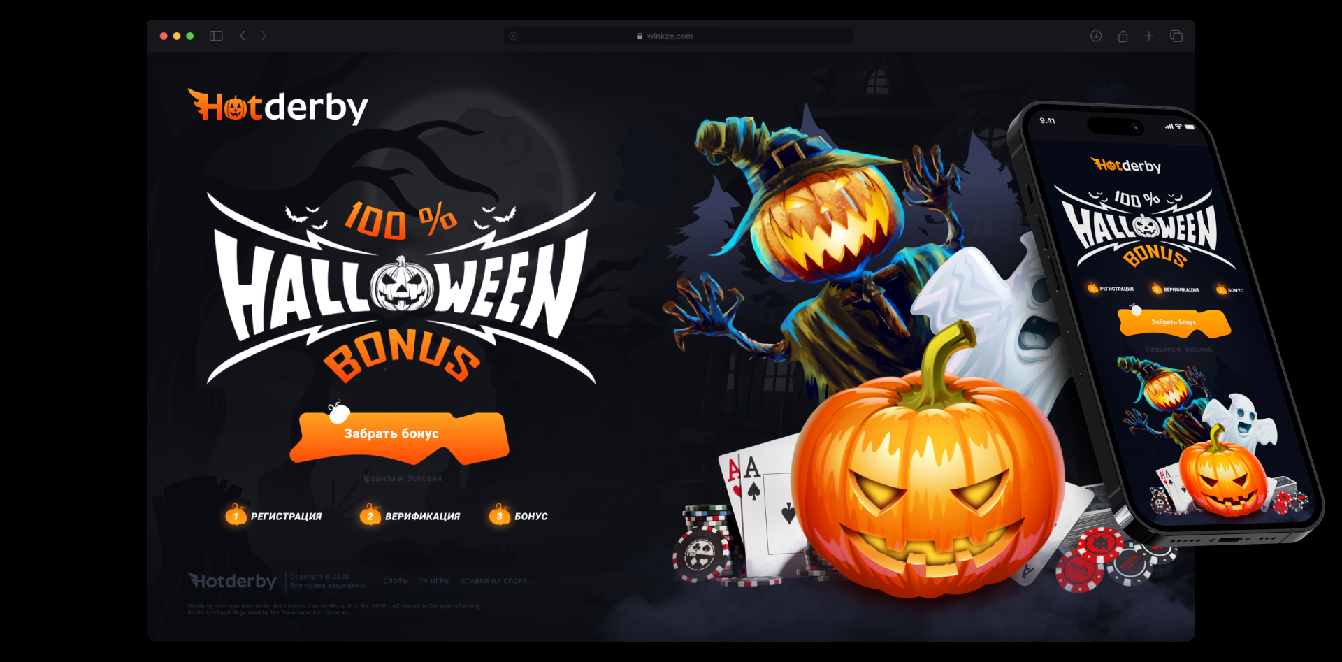 A Halloween-themed landing page was created for the Hotderby brand. The design captures the festive atmosphere with iconic elements like pumpkins, ghosts, and spooky details, creating a vibrant and memorable experience. The landing page features a bonus offer to encourage user registration and engagement. It is fully optimized for mobile devices, ensuring a seamless experience across all platforms.